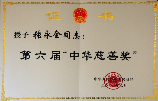 公司董事长张永全再次荣获第六届中华慈善奖爱心捐赠个人,这是董事长第三次获得该奖项。该奖项获奖人员全国共20人。7月15日,公司董事张玉凤代表董事长赴京参会,并得到温家宝总理等国家领导人的亲切接见。