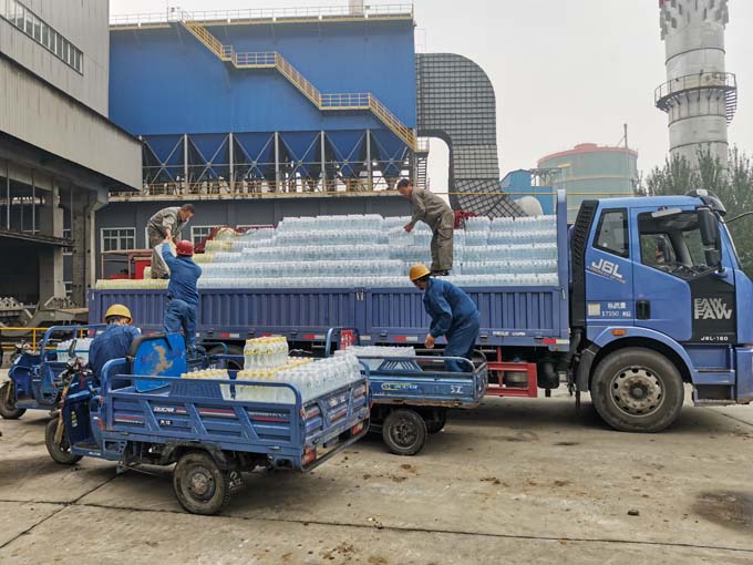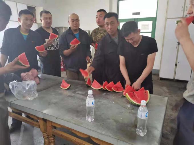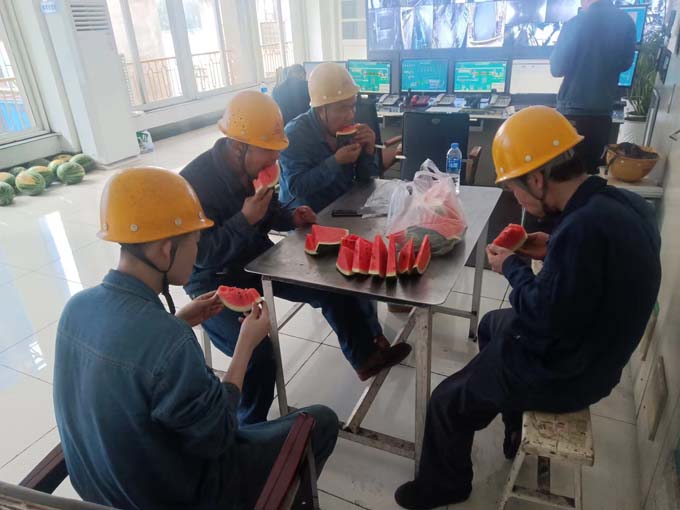 厂房里,公司工会为奋战在一线的职工发放清凉解署的盐汽气和西瓜,给大家送去一份夏日的清凉。工会主席叮嘱职工要注意生产安全,合理安排作息时间,做好防暑降温工作。