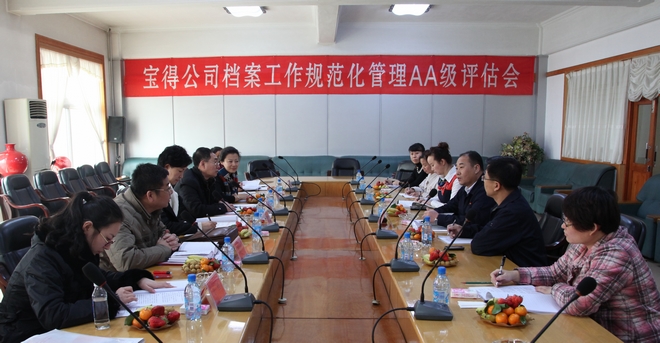 1月31日,由辽宁省档案局业务指导处欧平处长、副处长葛仁军、科员于佳,市档案局赵寿安副局长、王一鸣处长、杨琳副处长组成的评估组,到公司进行档案工作规范化管理“AA”级评估,经过认真细致的检查,一致通过了公司档案工作规范化管理“AA”级评估。