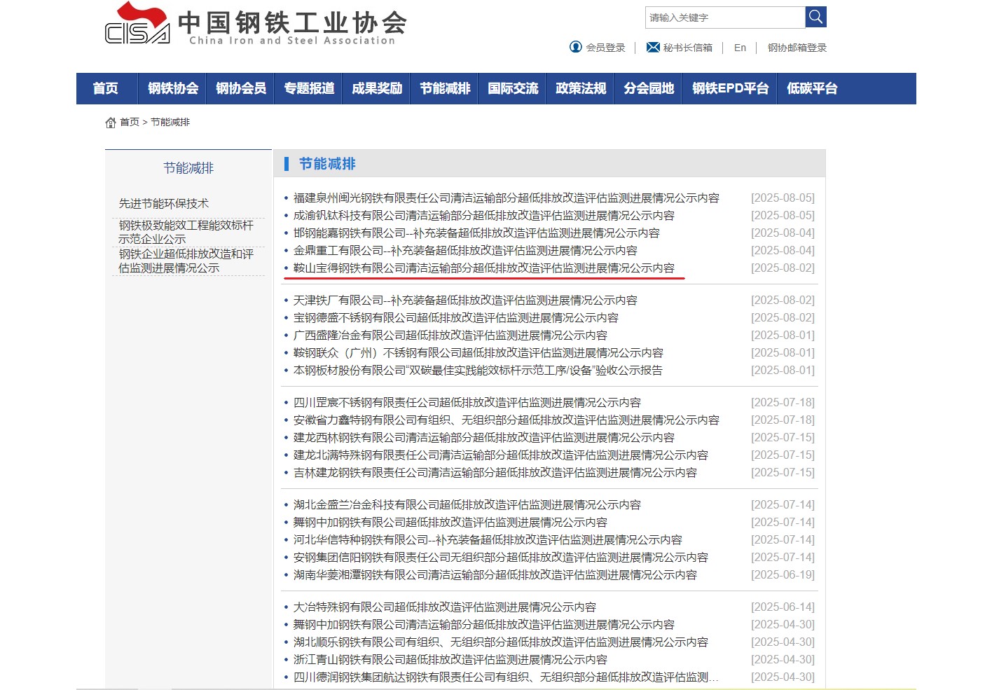 2025年8月2日,中国钢铁工业协会对欧亿-中国一站式体育服务平台超低排放清洁运输改造和评估监测情况进行了公示,宝得钢铁有限公司成为鞍山市除鞍钢外首个完成超低排放清洁运输改造和评估监测工作的企业,标志着公司超低排放改造项目取得重要阶段性成果。不仅为企业可持续发展奠定了坚实基础,也为鞍山地区的环境保护作出了积极贡献,是企业履行社会责任的生动实践。