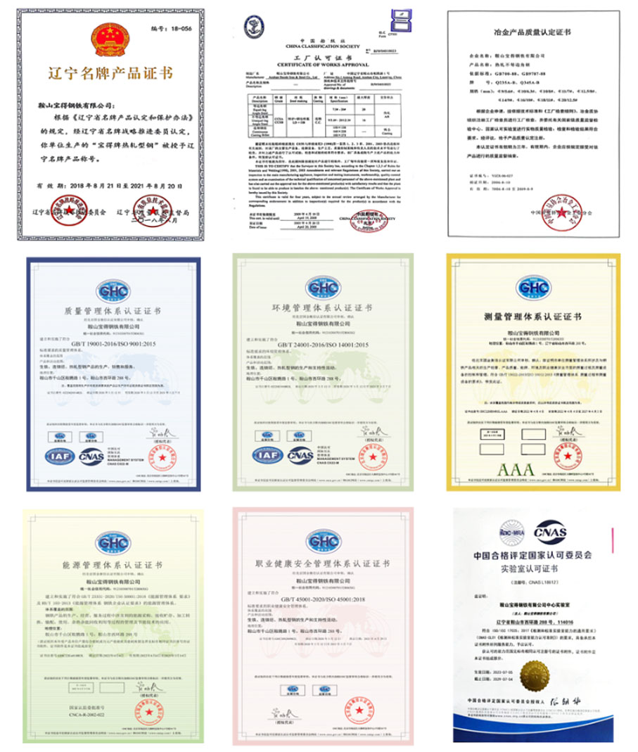 “宝得”牌钢材以科学的管理,先进的装备,严格的检测为保障,产品外型尺寸精度高,成分稳定,性能可靠,表面质量好,实物质量高于国家标准,达到发达国家同类产品水平,屡获国家“冶金产品实物质量金杯奖” 和“辽宁省名牌产品”称号。公司通过了GB/T 19001/ISO 9001质量管理体系、GB/T 24001/ ISO 14001环境管理体系、GB/T 45001/ISO 45001职业健康安全管理体系、GB/T 23331 / ISO 50001和RB/T 103能源管理体系、GB/T 19022/ISO 10012测量管理体系审核认证,获得方圆标志认证中心颁发的“管理创新奖”,取得国家船级社(CCS)的生产工厂认可证书和辽宁省进出口检验检疫局颁发的“产品出口免检认可证书”。